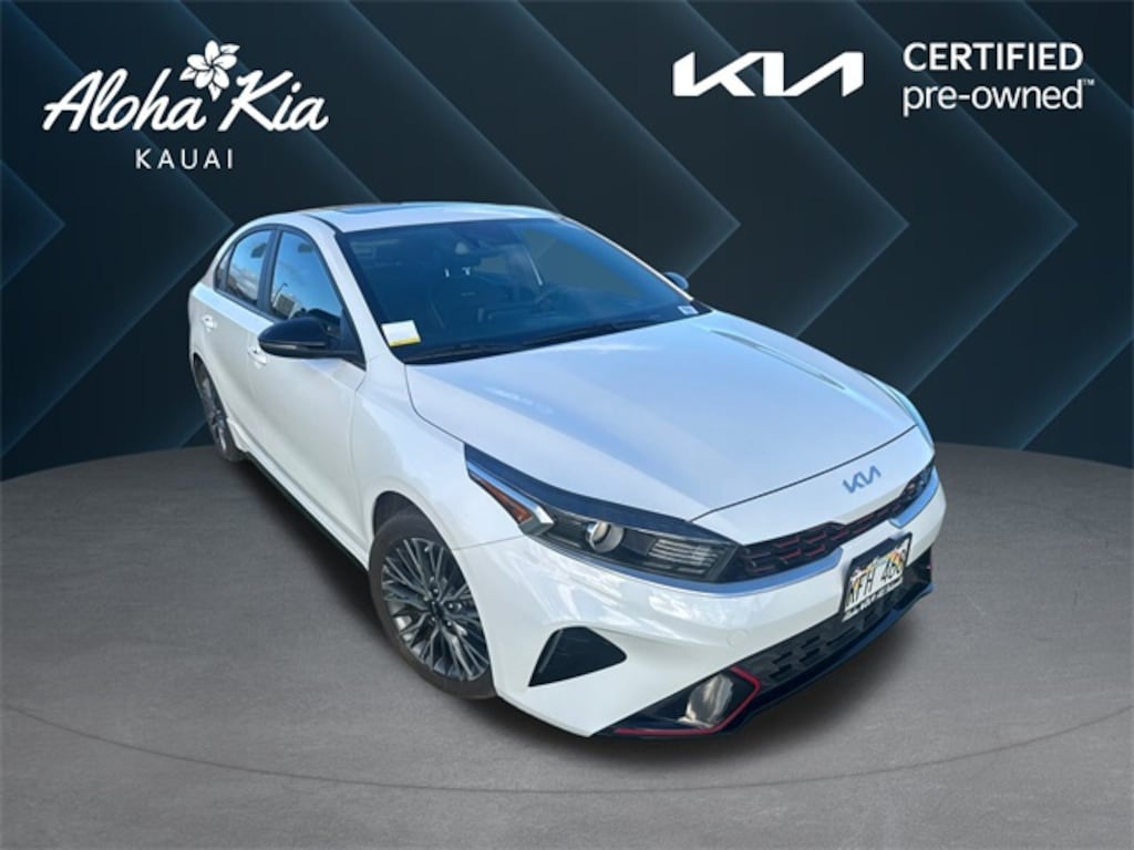 Certified. Snow White Pearl 2023 Kia Forte GT-Line FWD CVT 17" x 7.0J Alloy Wheels, 4-Wheel Disc Brakes, 6 Speakers, ABS brakes, Air Conditioning, Alloy wheels, AM/FM radio: SiriusXM, Apple CarPlay & Android Auto, Auto High-beam Headlights, Automatic temperature control, Brake assist, Bumpers: body-color, Cloth & SynTex Seat Trim, Delay-off headlights, Driver door bin, Driver vanity mirror, Dual front impact airbags, Dual front side impact airbags, Electronic Parking Brake (EPB), Electronic Stability Control, Emergency communication system, Exterior Parking Camera Rear, Forward Collision Avoidance-Assist - Cyclist, Front anti-roll bar, Front Bucket Seats, Front Center Armrest, Front dual zone A/C, Front fog lights, Front reading lights, Front wheel independent suspension, Fully automatic headlights, GT-Line Premium Package, Heated door mirrors, Illuminated entry, Leather Shift Knob, Leather steering wheel, LED Interior Lighting, Low tire pressure warning, Navigation System, Navigation-Based Smart Cruise Control (NSCC), Occupant sensing airbag, Outside temperature display, Overhead airbag, Overhead console, Panic alarm, Passenger door bin, Passenger vanity mirror, Power door mirrors, Power steering, Power Sunroof, Power windows, Radio data system, Radio: 10.25" Display Audio, Radio: harman kardon Premium Audio, Rear seat center armrest, Rear window defroster, Remote keyless entry, Security system, Smart Cruise Control w/Stop & Go, Speed control, Split folding rear seat, Spoiler, Sport steering wheel, Steering wheel mounted audio controls, Tachometer, Telescoping steering wheel, Tilt steering wheel, Traction control, Trip computer, Turn signal indicator mirrors, Variably intermittent wipers, Wireless Charging. 2.0L I4 MPI